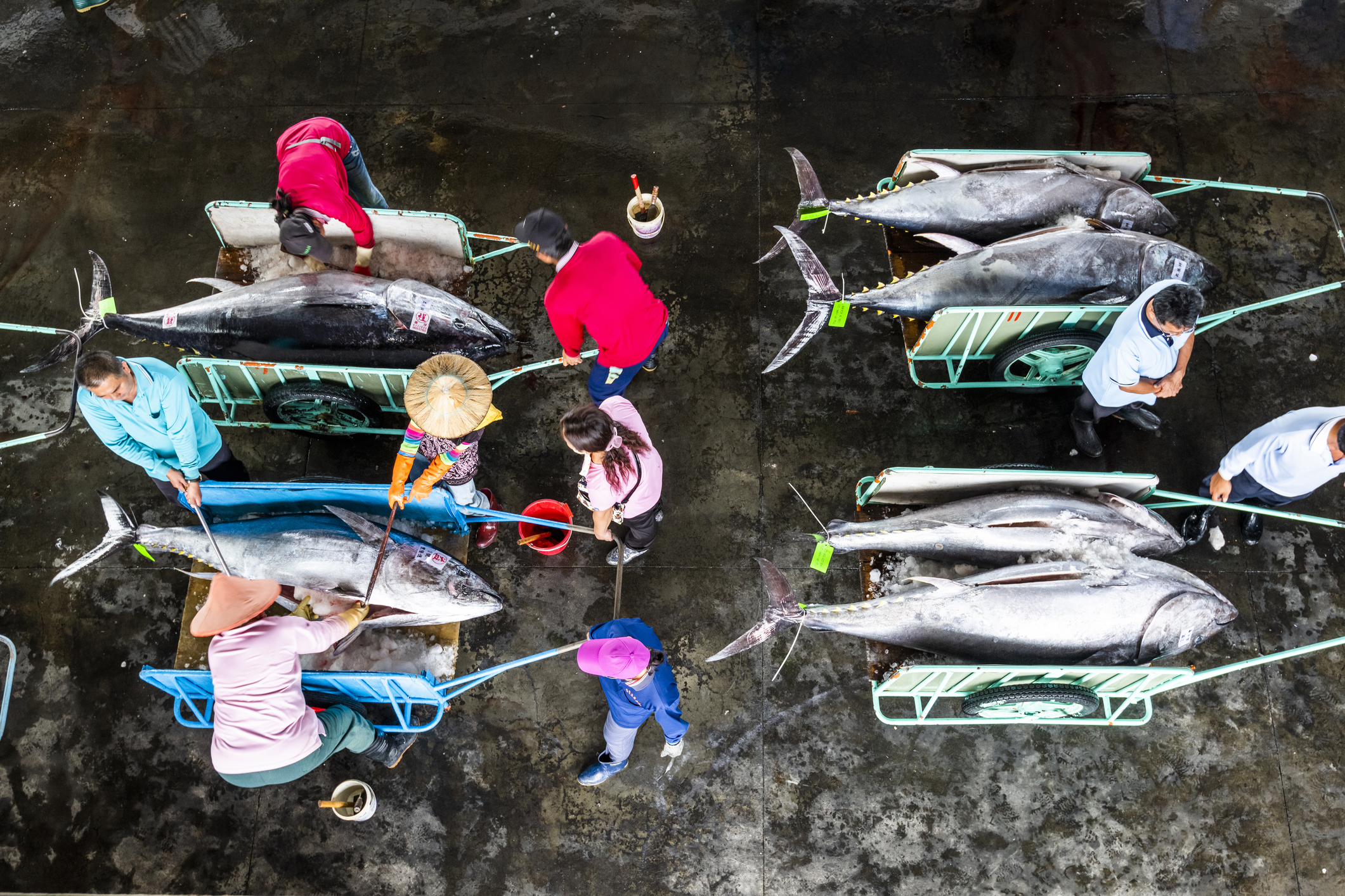 The fish trade operates at a highly professional level, restricting participation in the bidding to licensed dealers. During bluefin season, successful tuna boats hoist their catch onto the vessels and transport it to the fish market, where each tuna is tagged with the number of the boat or name of the captain. Fishermen's association staff then attach sales slips and register the details.